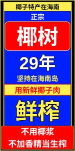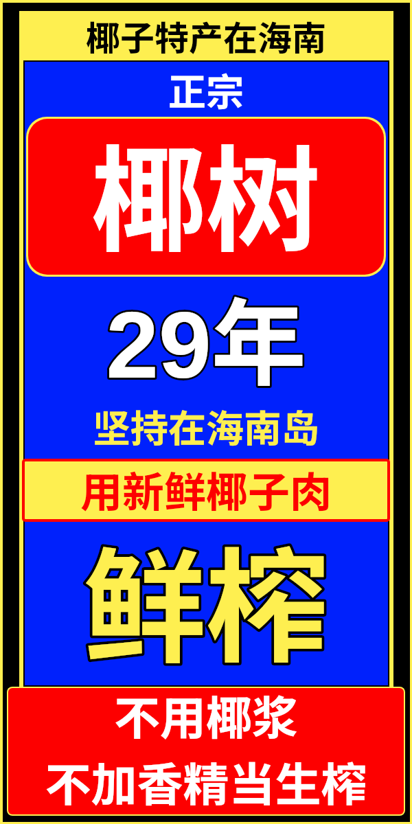 • 默认文字:[椰子特产在海南, 正宗, 椰树, 29年, 坚持在海南岛, 用新鲜椰子肉, 鲜榨, 不用椰浆 不加香精当生榨]